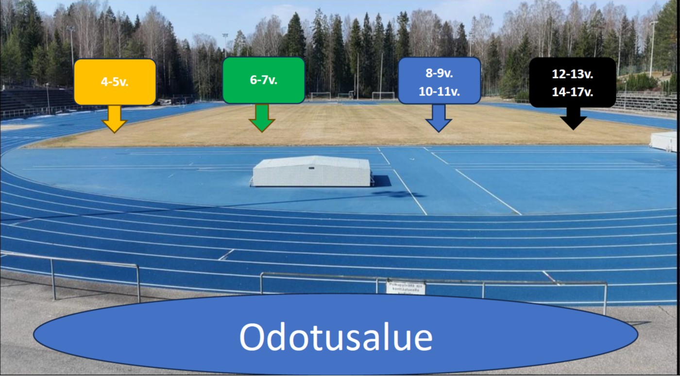 Mukaan harjoituksiin juomapullo ja ulkoliikuntavarusteet. Urheilijat voivat saapua kuvan mukaisesti ikäryhmien aloituspaikoille, jossa valmentajat pitävät ikäryhmän kylttiä esillä! Noudatetaan varovaisuutta liikuttaessa radalla. Ryhmien aloitusta voi odottaa kuvan mukaisella odotusalueella!