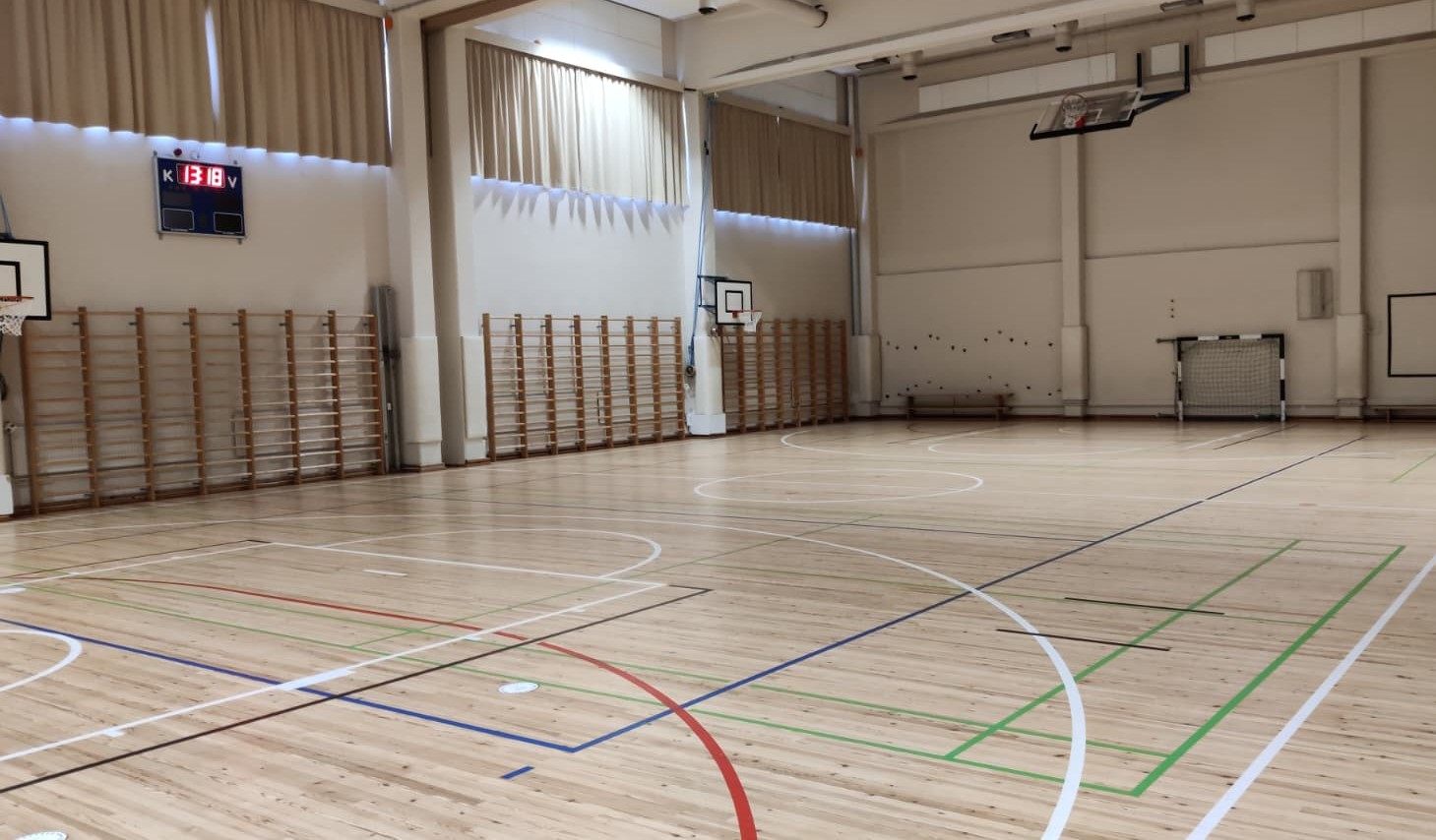 Liikuntasali on 505 m² ja se on jaettavissa väliverholla kahteen osaan. Lattiamateriaalina on TRV urheilulattia. Salin hyötymitat: pituus on 26,6 m, leveys 19 m ja korkeus keskellä 7,4 m ja sivuilla 5,1 m. Tilassa saa olla samaan aikaan enintään 75 henkilöä.